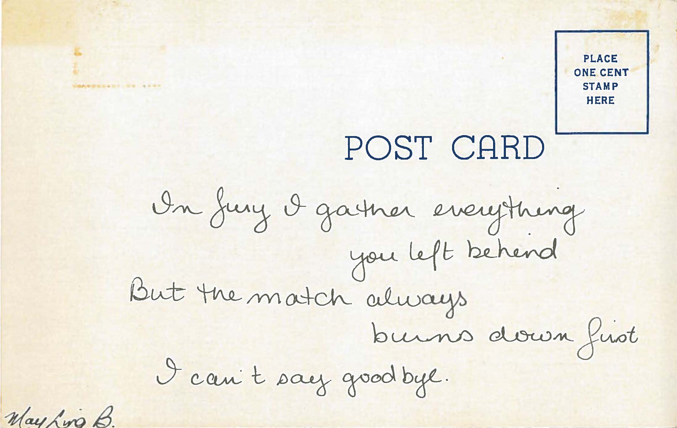 Post Card Series Post Card Series 14 June 23, 2014 May Ling B Leave a comment In fury I gather everything you left behind But the match always burns down first I can't say goodbye Spread the word: Click to email a link to a friend (Opens in new window) Email Click to share on Facebook (Opens in new window) Facebook Click to share on X (Opens in new window) X Click to print (Opens in new window) Print Like Loading... Related